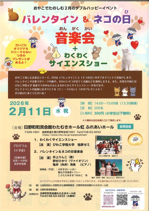 おやこで楽しむ音楽会シリーズ、2月は「バレンタイン」と「ネコの日」のダブルイベントです。